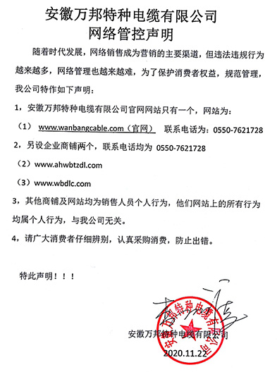 鄭重聲明:安徽萬邦特種電纜有限公司官方網站為:www_wanbangcable_com.zhwpt.com,除此之外無任何子網站或合作網站,其余均為假冒偽劣。電話:0550-7621728 13485756353 地 址:安徽省天長市滁州高新技術產業開發區經四路29號